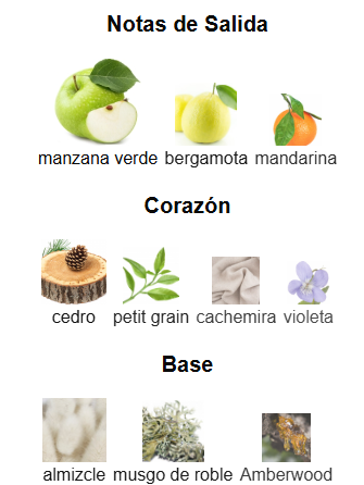 las Notas de Corazón son cedro, petit grain, cachemira y violeta;