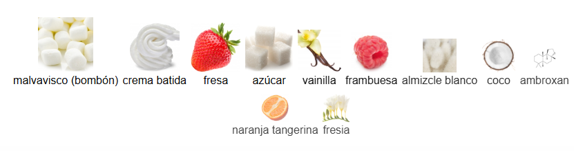 Notas de corazón: malvavisco, azúcar, vainilla, frambuesa.