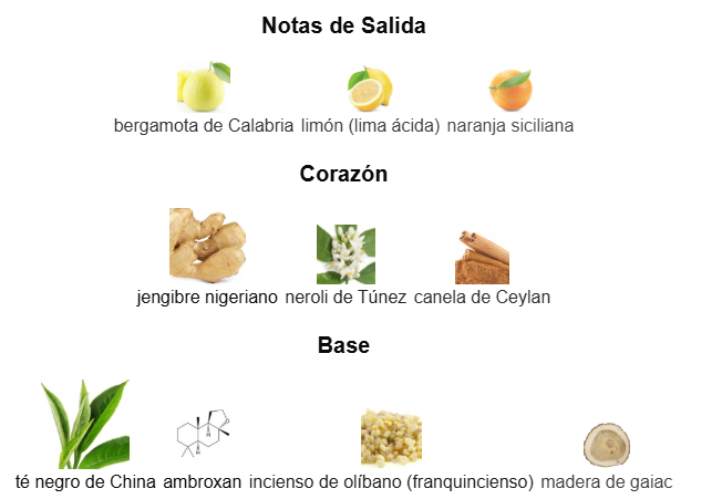 Las Notas de Salida son bergamota de Calabria, limón (lima ácida) y naranja siciliana;