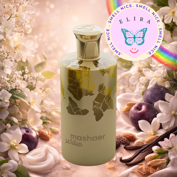 Mashaer, cuyo nombre significa "sentimientos", se distingue por un inicio limpio y jabonoso debido a los aldehídos, evolucionando hacia un cuerpo floral delicado con un fondo amaderado y frutal muy duradero