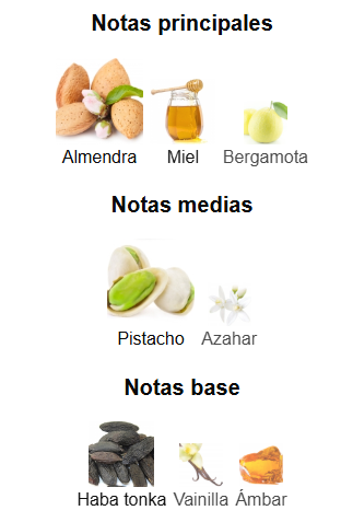 sus notas de fondo, haba tonka, vainilla y ámbar.