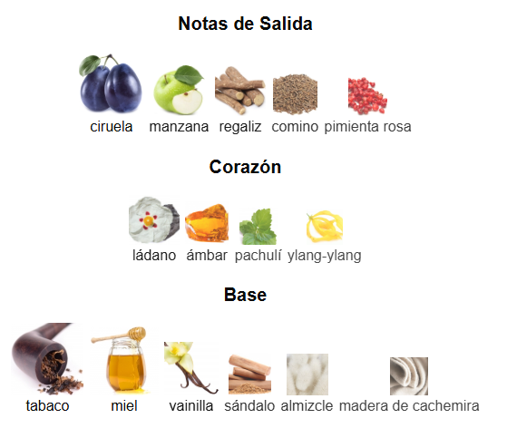 las Notas de Fondo son tabaco, miel, vainilla, sándalo, almizcle y madera de cachemira.