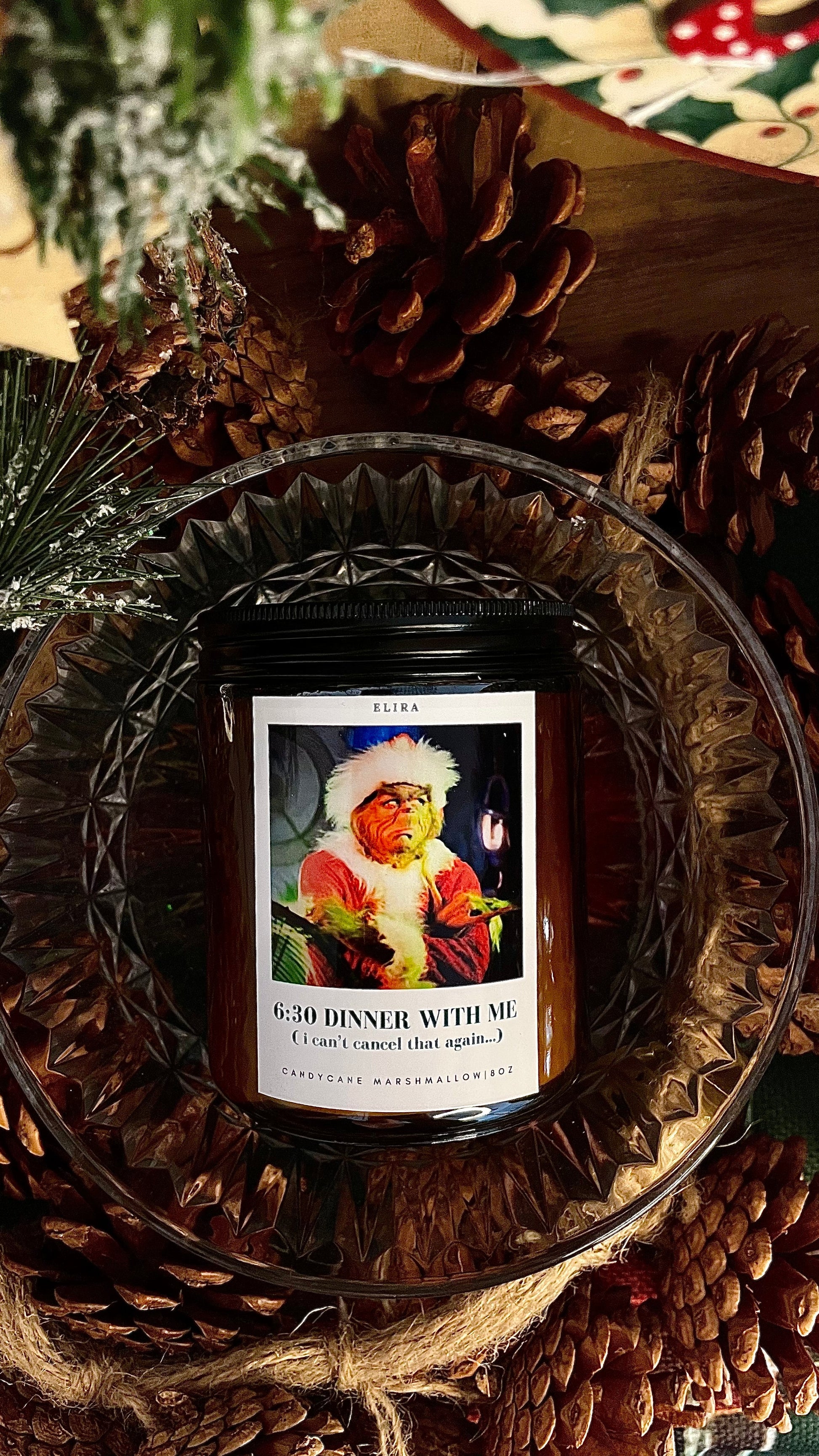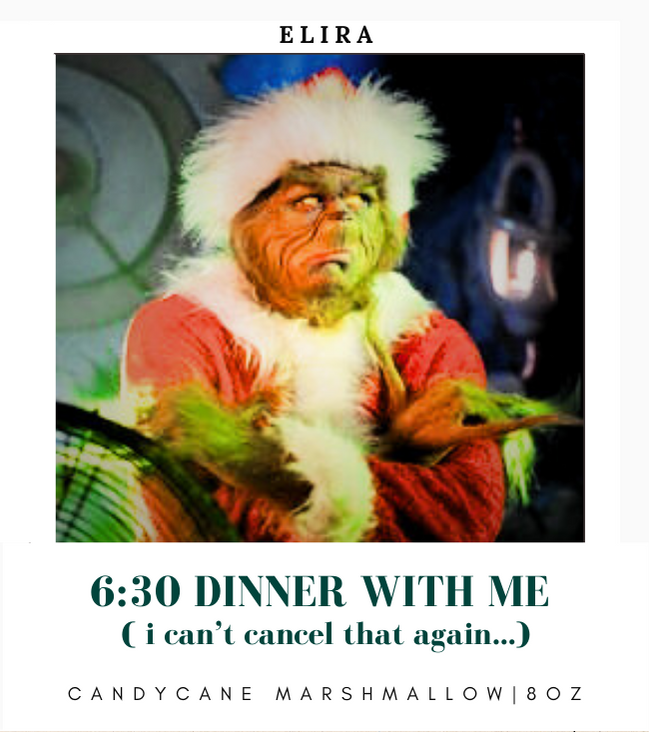 "6.30, cena conmigo mismo...no puedo cancelarlo otra vez!!", y por dentro está lleno de estilo grinch (es la única vela de navidad que es diferente por dentro).